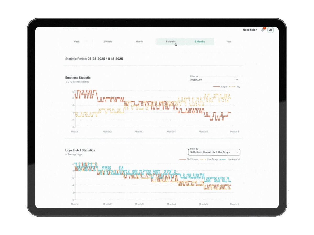 You can view graphical and visual analytics that reveal clients’ emotional and behavioral patterns over time, making long-term treatment planning more targeted.